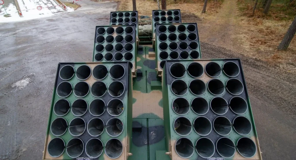 The system features six launch modules capable of carrying up to 600 MN-123 mines. The munitions are produced by Belma, also part of the PGZ group. Each container holds 100 mines, which can be deployed at distances between 30 and 90 metres, forming minefields up to 1.8 km in length.